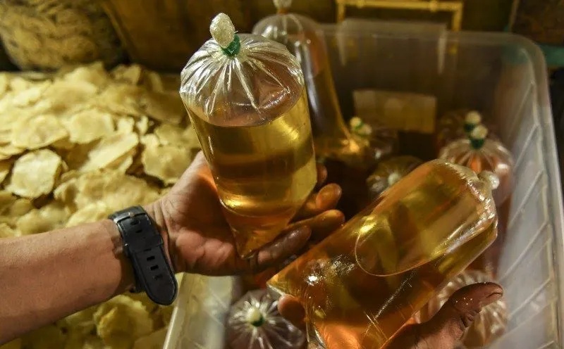 Ilustrasi – Pedagang menata minyak goreng curah di kiosnya di Pasar Minggu, Jakarta. (Antaranews.com)