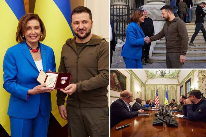 Rekaman yang diposting oleh Zelenskiy di Twitter pada hari Minggu menunjukkan dia, diapit oleh pengawal bersenjata dan mengenakan seragam militer, menyapa delegasi kongres AS yang dipimpin oleh Pelosi di luar kantor kepresidenannya pada hari sebelumnya.