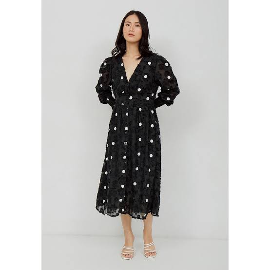 Kalau mau tampil lebih cute, kamu bisa memilih model Savnion – Amitie dots dress in black.