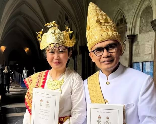“Sebagai bentuk penghormatan, saya & Sari mengenakan pakaian adat#Lampung yang ternyata senada dengan jubah emas Raja Charles III.#inidiplomasi #indonesianway, ” tulis pria yang piawai meniup saksofon ini.