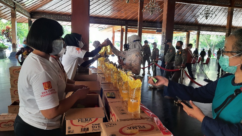 FAKTUAL-INDONESIA: Pemerintah Kota (Pemkot) Solo menggelar pasar murah minyak goreng untuk masyarakat yang membutuhkan, di Balai Kota Solo, Selasa (5/4/2022). Sebanyak 3.000 liter minyak goreng kemasan merek Filma disediakan dari Eka Tjipta Foundation, PT Sinar Mas melalui kegiatan Corporate Social Responsibility (CSR).