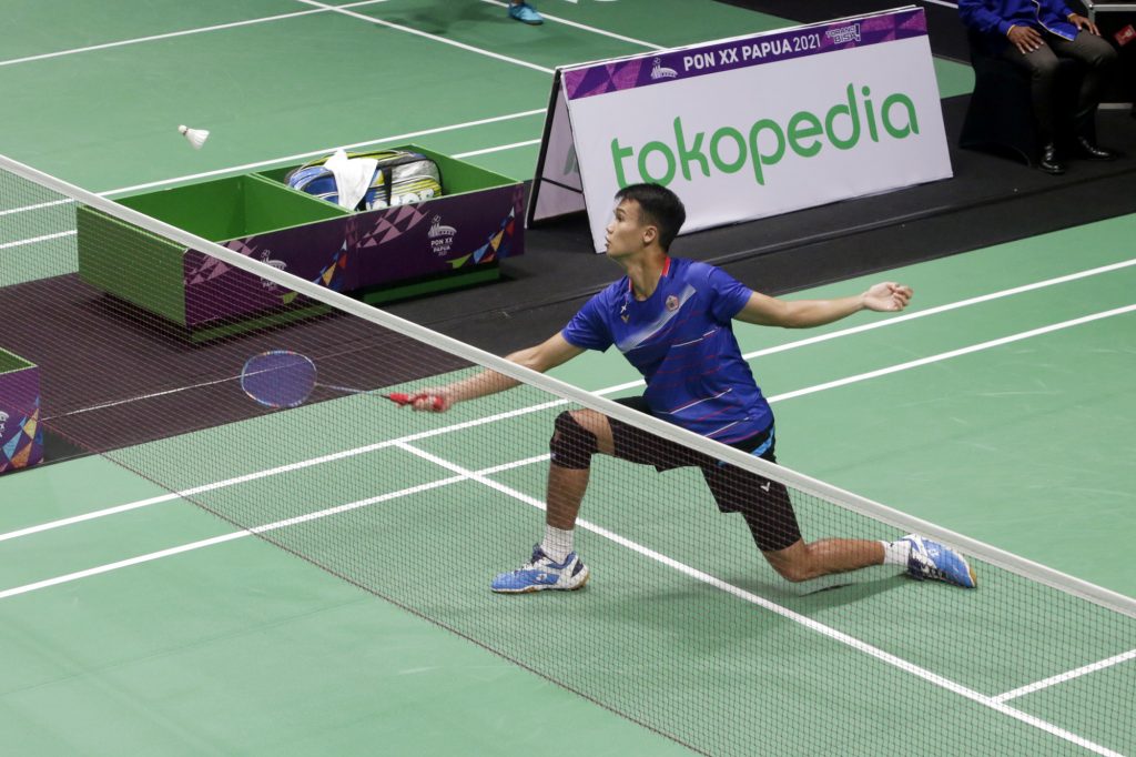 Atlit Bulutangkis Putra Beregu DKI Jakarta, Christian Adinata melawan tim beregu Bali, Nyoman Tryadnya dalam pertandingan penyisihan Beregu Putra di GOR Waringin, Abepura, Jayapura, Papua, Kamis (7/10/2021). (FOTO : PBPON XX PAPUA/DHONI SETIAWAN)